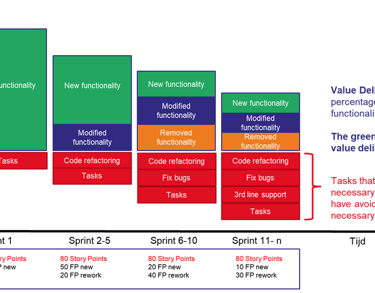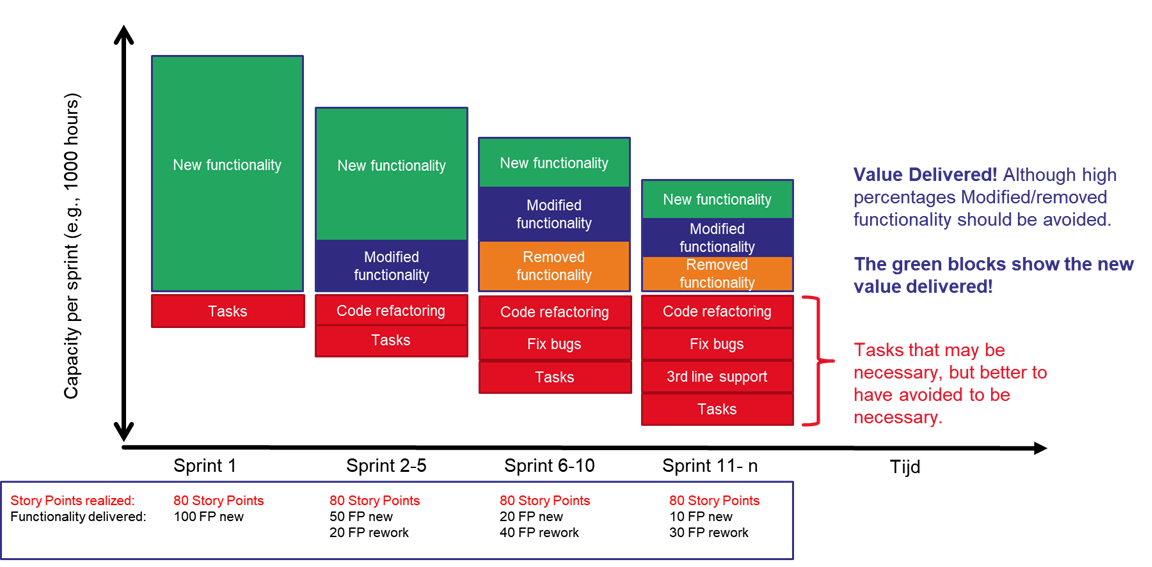 Many (agile) teams use non-standardized metrics like Story Points to estimate the work to be done in the next sprint and to understand velocity (e.g., Story Points per sprint). As Story Points is not a standardized unit of measure, metrics based on story points can't be used to benchmark or to aggregate into useful management information. In addition, as the figure above shows, teams assign story points to any activity that requires effort, also the activities that don't produce value for the user or customer, and which maybe could have been avoided in the first place. Therefore, many organizations suffer from a lack of transparency when it comes to the value delivery function.