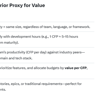 Value-Driven Prioritization: Ranks features and projects by business value per FP, focusing effort on high-impact work.