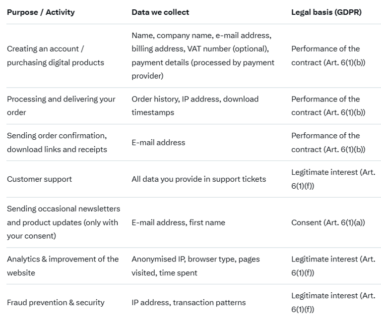 Payment providers (Stripe, PayPal, Mollie, iDEAL) – they process payment data under their own privacy policies.